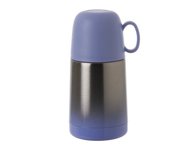 Garrafa térmica 250ml com acabamento degradê, contém tampa hermética rosqueável com botão de acionamento e tampa externa plástica com alça, podendo ser utilizada como xícara.