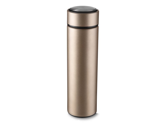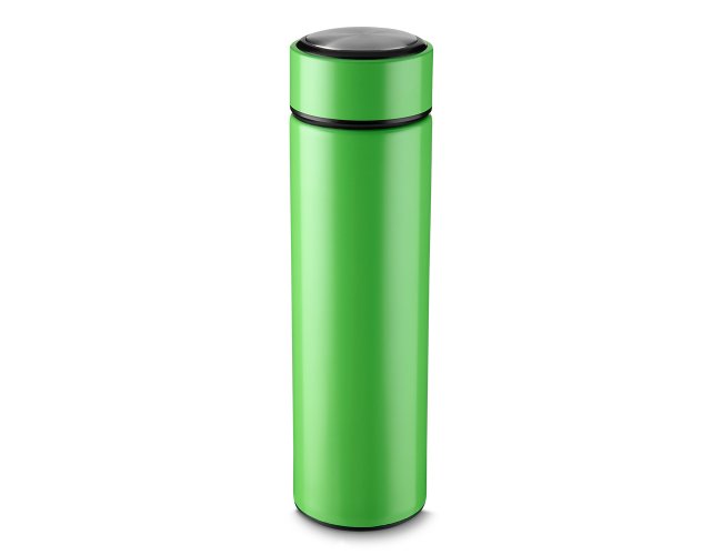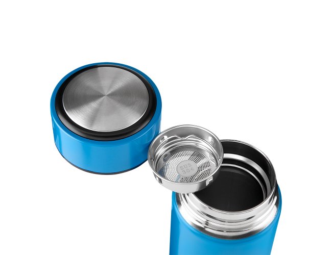 Garrafa térmica em aço inox com parede dupla isolada a vácuo, com capacidade até 450ml. Tampa rosqueável com anel de silicone para vedação. Possui infusor para chás.
