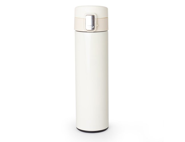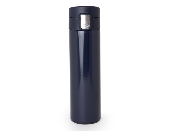 Garrafa térmica em inox 304 com parede dupla, capacidade de 450ml. Tampa com botão de acionamento e trava de segurança.