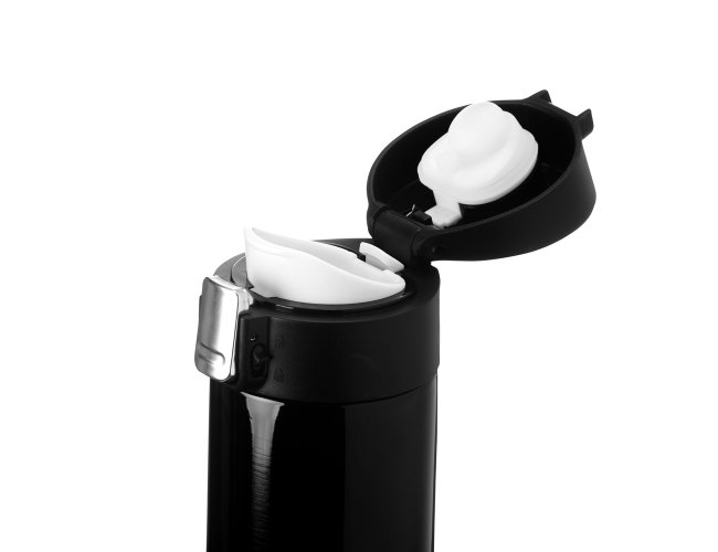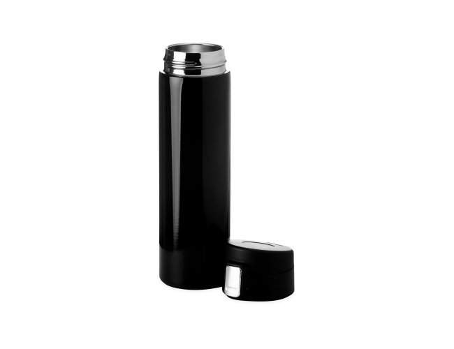 Garrafa térmica em inox 304 com parede dupla, capacidade de 450ml. Tampa com botão de acionamento e trava de segurança.
