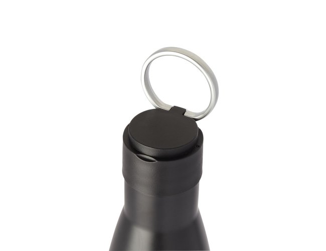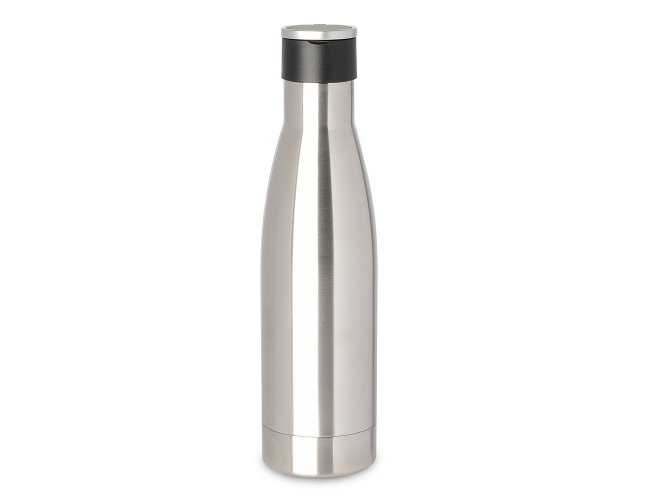 Garrafa térmica em aço inox isolada a vácuo com parede dupla, tampa de plástico com alça de transporte de aço inoxidável. Com capacidade de até 500ml.
