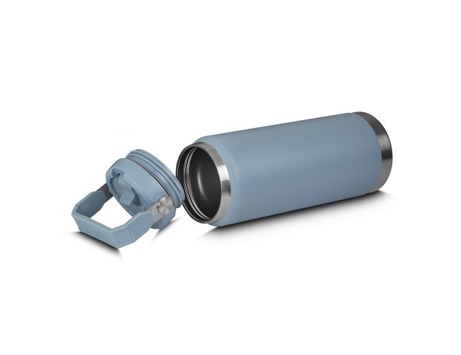 Garrafa térmica em aço inox com parede dupla com capacidade de até 900ml. Tampa rosqueável com anel de silicone para vedação. Alça de transporte em plástico. Permite-se hidratar pelo bico, com canudo. Pintura a pó.