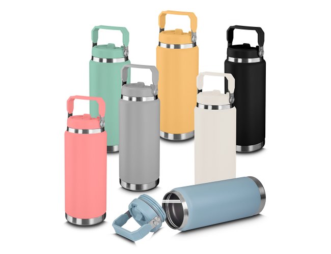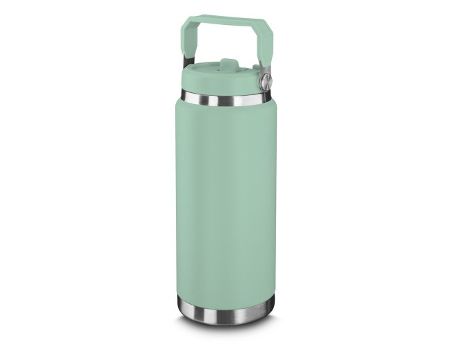 Garrafa térmica em aço inox com parede dupla com capacidade de até 900ml. Tampa rosqueável com anel de silicone para vedação. Alça de transporte em plástico. Permite-se hidratar pelo bico, com canudo. Pintura a pó.