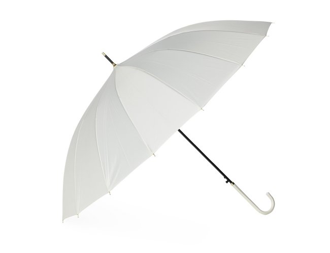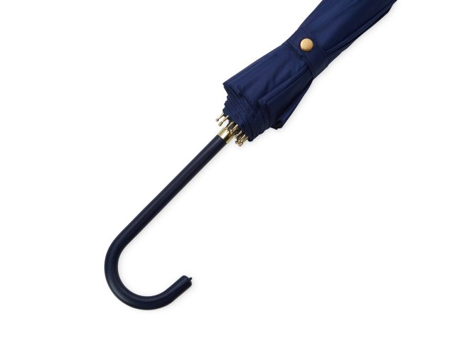 Guarda-chuva de poliéster com abertura automática, estrutura em aço e 16 varetas em fibra de vidro. Possui pegador em couro sintético com botão de acionamento.