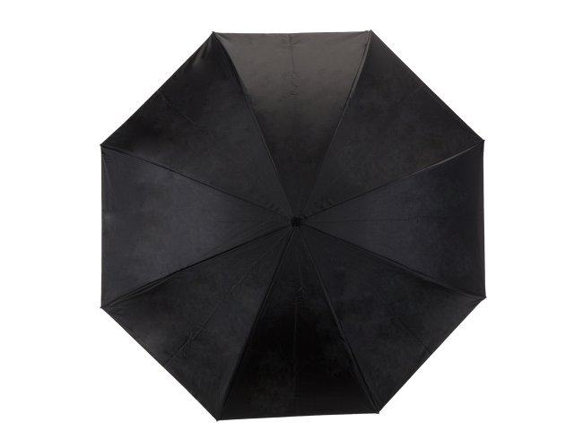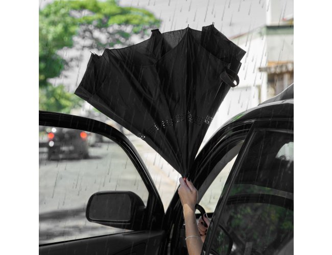 Guarda-chuva invertido com forro interno Personalizado com a sua logomarca. Tecido de nylon impermeável preto, possui um mecanismo inovador permitindo que o usuário não se molhe ao entrar e sair de ambientes devido sua abertura invertida, quando feito o movimento para fechar as varetas inverterão para cima criando um formato circular impedindo a chuva de atingir o usuário, podendo “segurar” a chuva enquanto entra/sai de um ambiente e depois virando o guarda-chuva irá escorrer a água. Forro interno para preservação das 8 varetas, evitando contato com a água e assim prolongando seu tempo de uso sem enferrujar. Ao impulsionar o fechamento invertido fica mais rápido e prático o modo de secar e ser guardado, pode ser apoiado no chão que permanecerá em pé para escorrer a água. Pegador plástico fosco em formato C, botão acionador vermelho e fita com velcro(contorno marrom) para lacre.