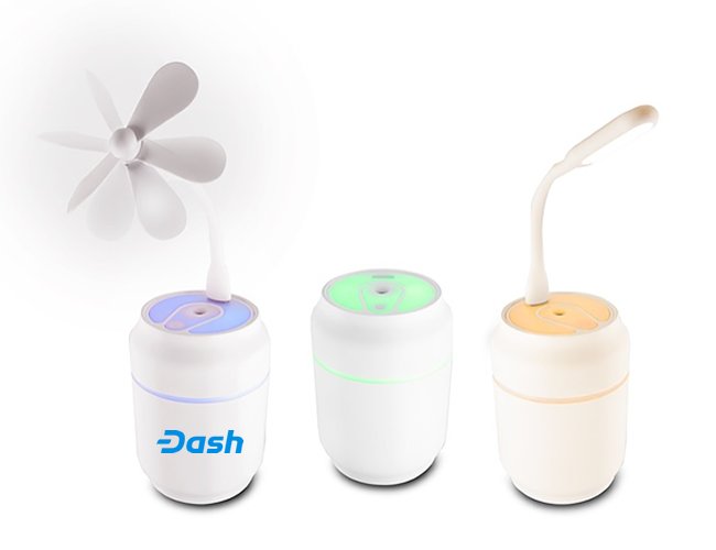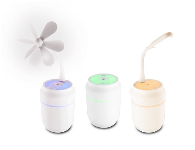 Umidificador pessoal para mesa com 200ml de capacidade e funcionamento por 8 horas. Possui saída USB para Lâmpada Led ou Ventilador (inclusos). Funcionamento por cabo USB. Possui iluminação multicores se desejado. 78(Diam) x 105 mm.