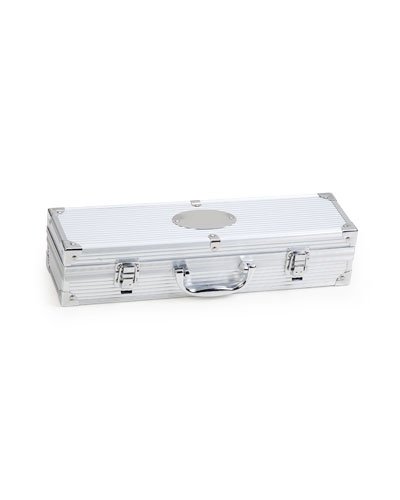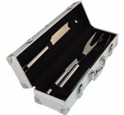 Kit churrasco 3 peças em maleta de alumínio com relevo. Possui: faca, garfo e pegador em inox(todas peças possuem proteção plástica) detalhes em metal nas bordas da maleta, duas dobradiças na parte inferior, uma alça e duas presilhas para travar/abrir maleta. Parte interna revestida de tecido tnt e velcro para guardar as peças." observação: Maleta 11,9 cm x 37 cm x 7,8 cm – Faca 32,5 cm x 2,4 cm – Garfo 34,6 cm x 3,3 cm – Pegador 34,3 cm x 6 cm