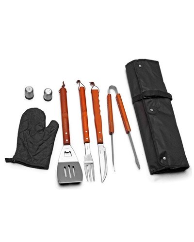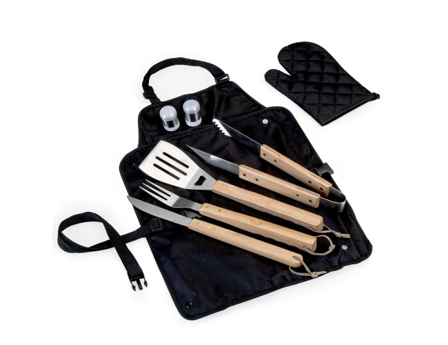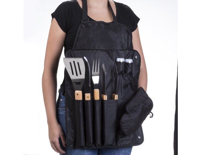 Kit churrasco 8 peças em estojo de nylon. Contém espátula, garfo, faca, pegador, dois saleiros, luva e avental (também utilizado como estojo). Talheres de inox com acabamento de madeira e avental de nylon com alça ajustável – possui botão e alça com fivela para lacre.