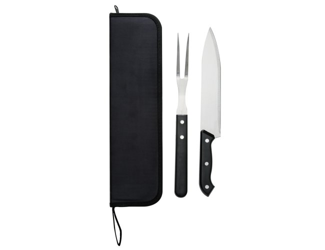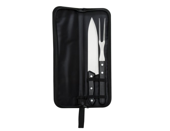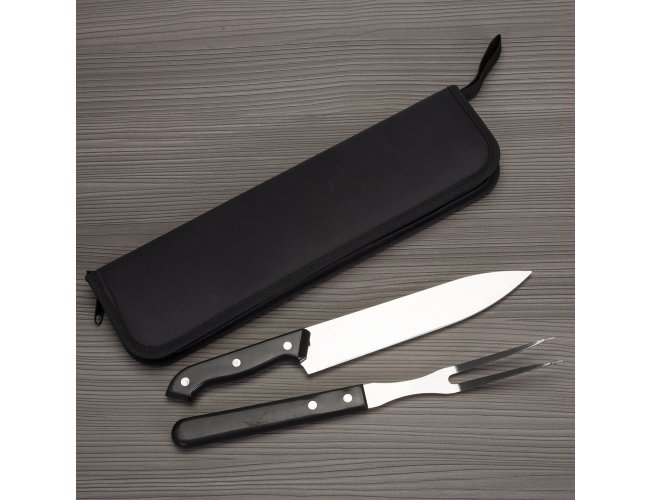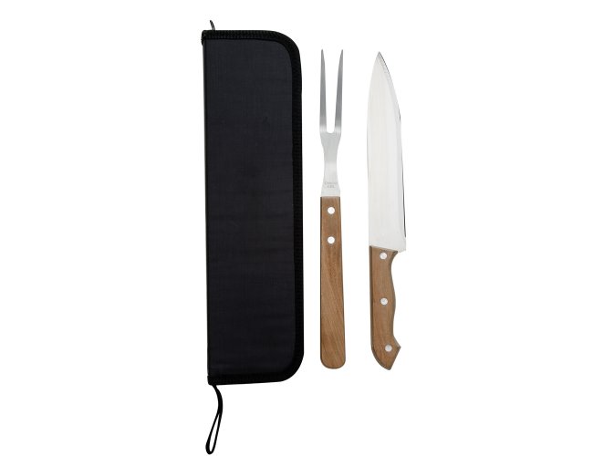 Kit churrasco 2 peças em estojo de nylon com alça. Possui: faca e garfo de madeira(na cor preto os cabos são de plástico), acompanha proteções plásticas e parte interna com velcro para guardar as peças.