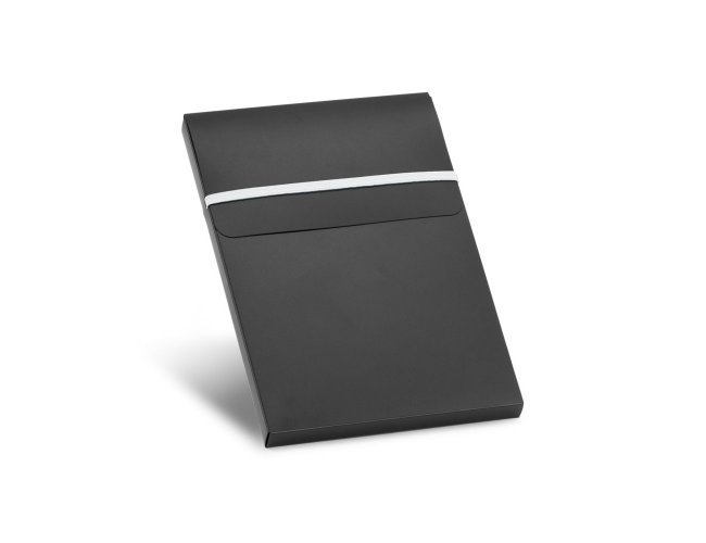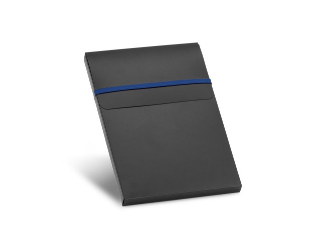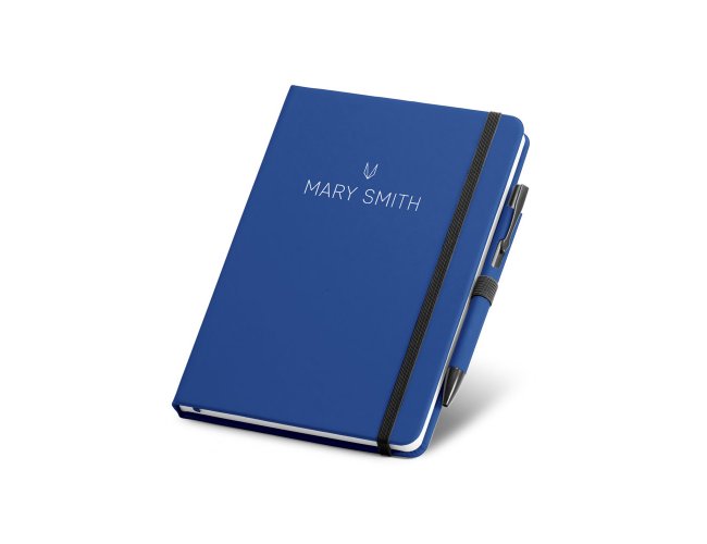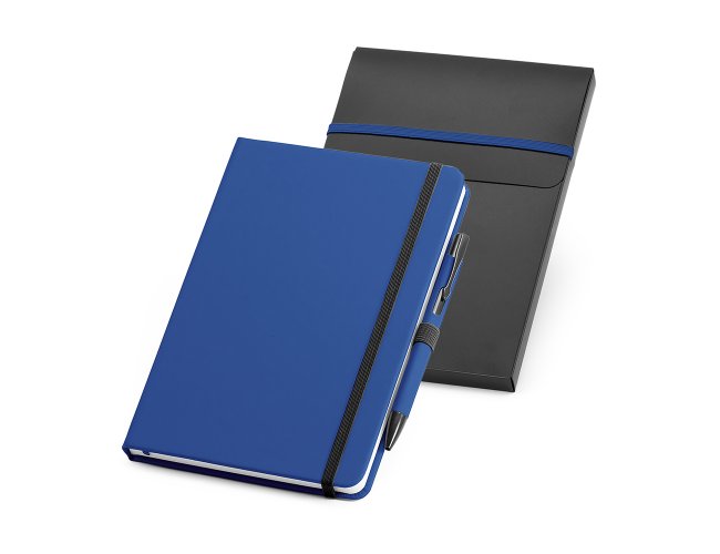 Kit de caderno A5 e esferográfica, caderno de capa dura em c. sintético com 160 páginas lisas, fita separadora e elástico. Esferográfica de escrita azul. Fornecido com caixa presente em PP com elástico. Esferográfica: ø10 x 137 mm | Bloco: 140 x 210 mm | Caixa: 155 x 214 x 13 mm