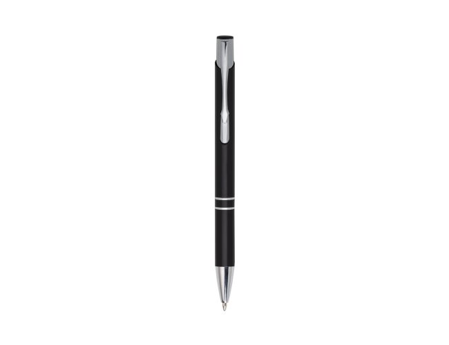 Caneta metal inteira colorida com detalhes prata. Clip metal com a ponta do acionador preto, parte inferior com dois anéis prata. Aciona por clique.