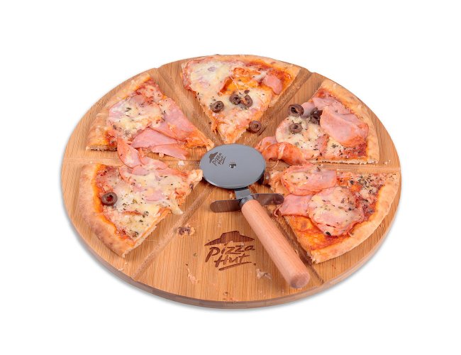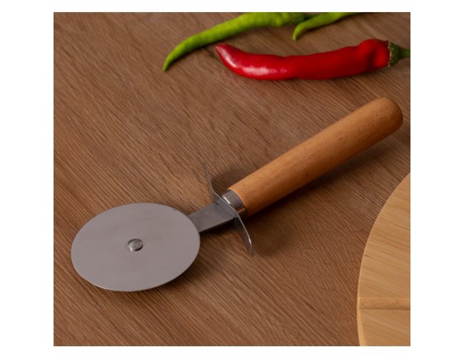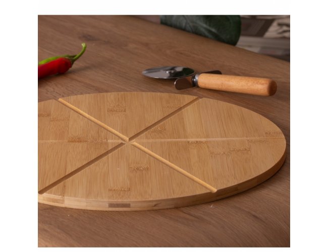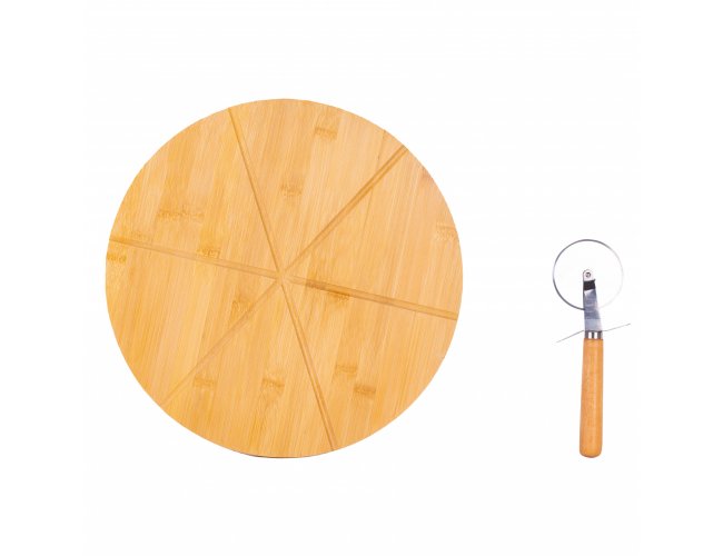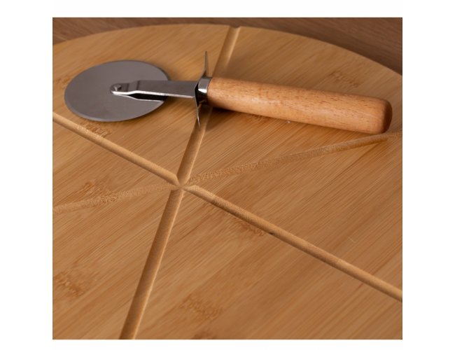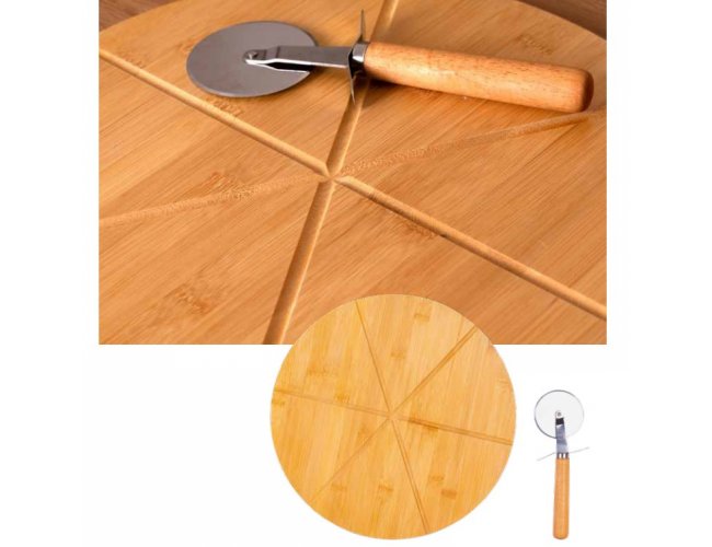 Kit pizzas contendo 2 peças: Tábua para pizza; Cortador. Obs.:Os componentes de madeira e bambu poderão apresentar tonalidades diferente.