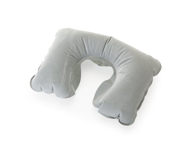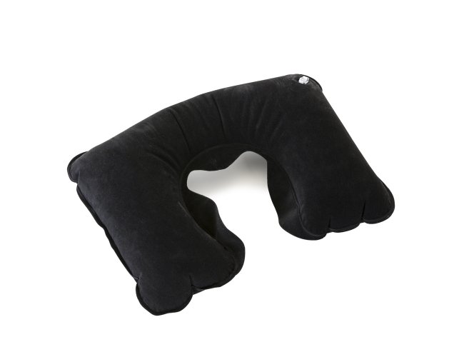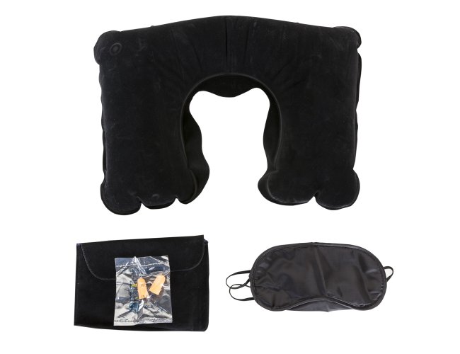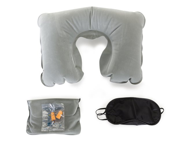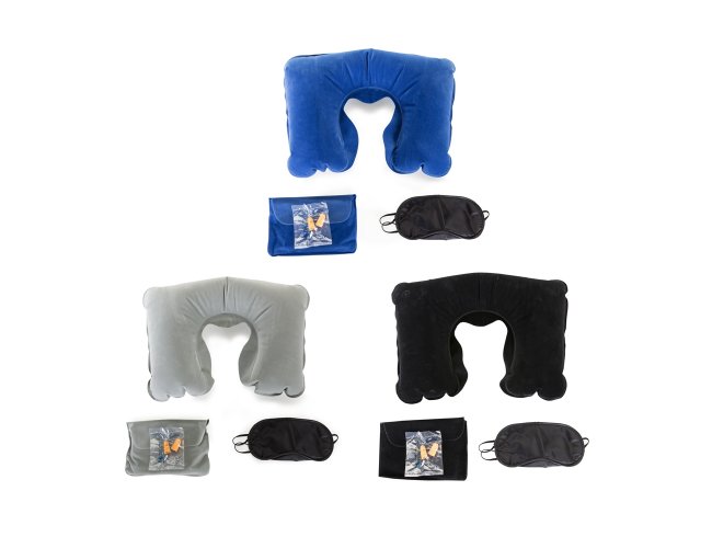 Kit viagem com 3 peças, contém: travesseiro inflável(revestido de veludo), máscara para olhos de cetim(revestido com espuma) e um par de protetor auricular. Travesseiro colorido, máscara sempre preta e protetor sempre laranja. Acompanha uma necessaire colorida de veludo para guardar o kit.