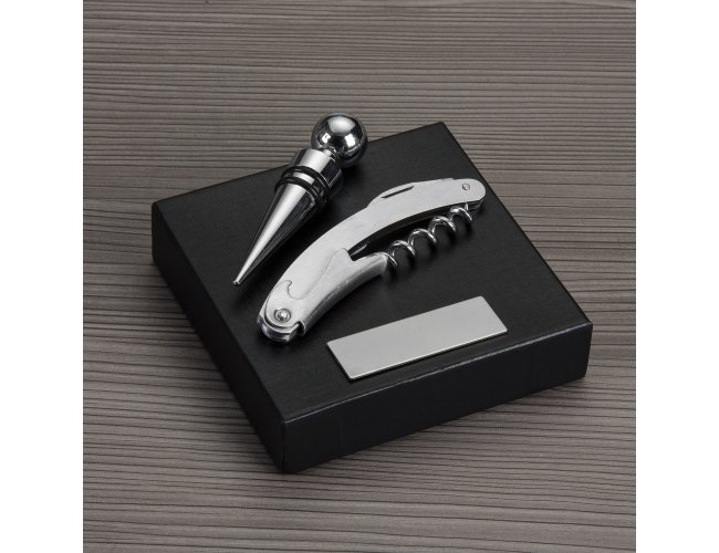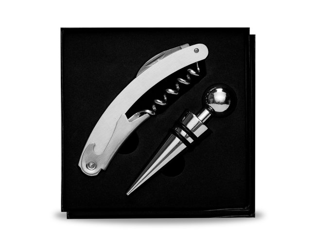 Kit vinho 2 peças em caixa de papelão com tampa, revestimento interno de espuma. Possui saca rolhas de metal e tampa de bico.