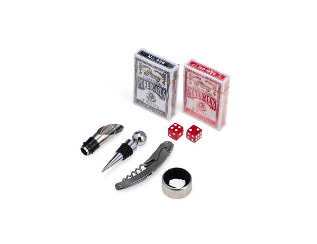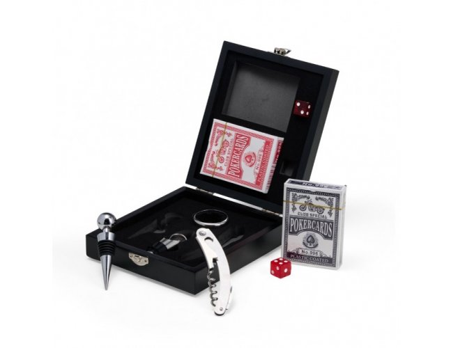 Se divirta enquanto degusta um bom vinho! Nosso kit vinho com 4 peças vem em um estojo feito em MDF com trava de segurança e área interna com berço de espuma. Contém wine collar, tampa de bico, bico condutor com tampa e saca-rolhas metálico com lâmina de corte e abridor de garrafa. Acompanham ainda 2 baralhos completos + 2 dados para uma noite completa de jogos, e uma plaquinha metálica para personalização. Azar é ainda não ter um kit desse!