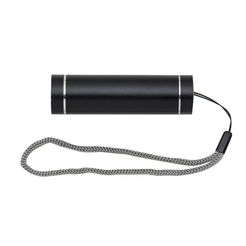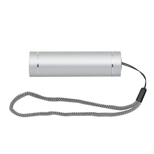 Lanterna bastão alumínio com led. Tampa de rosca lado oposto ao Led, possui acionador emborrachado em relevo e acompanha cordão. Possui anel prata em cada extremidade da peça, para utilizar basta colocar 3 pilhas AAA(não acompanha).