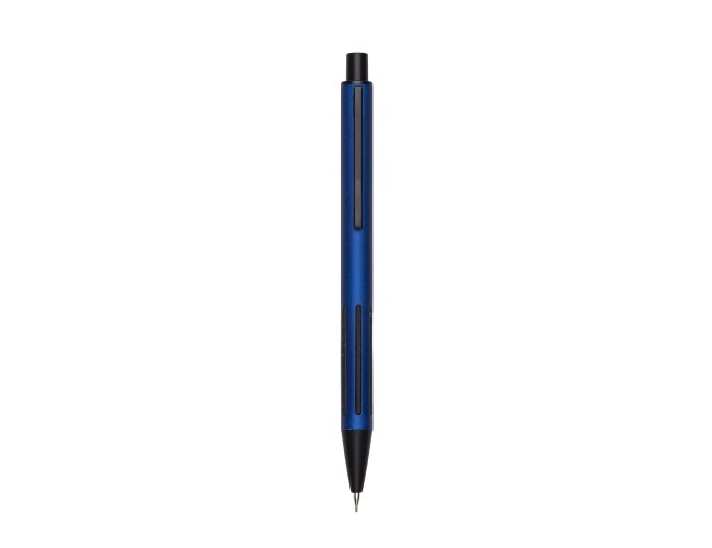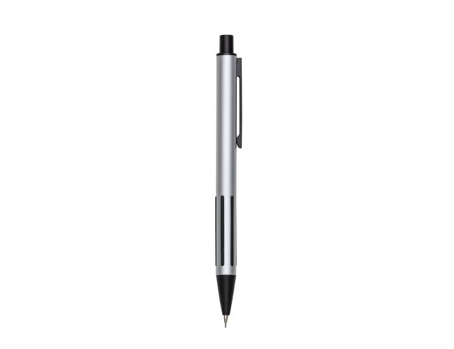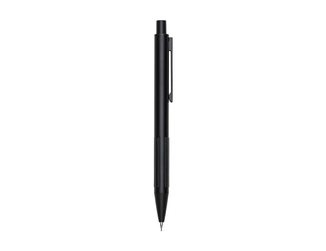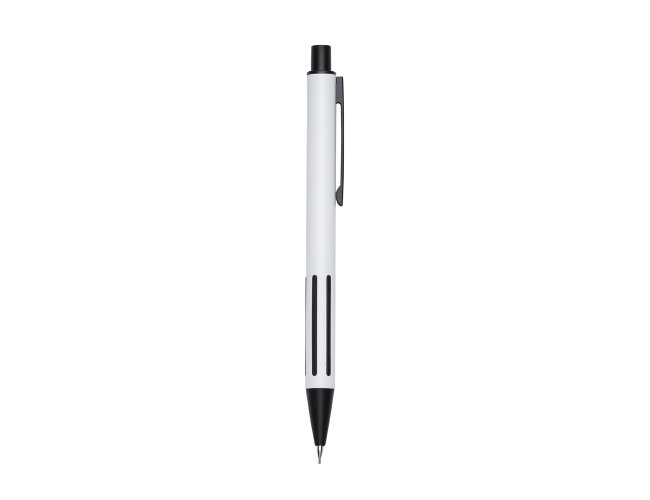 Lapiseira metal com pintura fosca e detalhes preto Personalizada com a sua logomarca. Clip metal, possui seis traços pretos emborrachados na parte inferior. Aciona por clique. Tamanho total aproximado (CxD): 13,9 cm x 1,3 cm. Peso aproximado (g): 15
