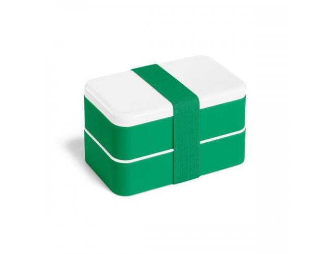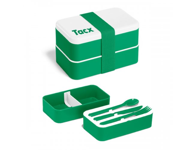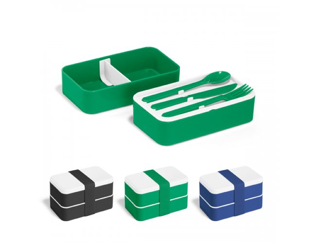 Marmita. PP e PS. Com 2 compartimentos (680 ml cada) e 1 divisória removível. 3 talheres: garfo, faca e colher. Fecha com banda elástica. Apta para microondas (retirar a tampa). Food grade. 180 x 100 x 100 mm