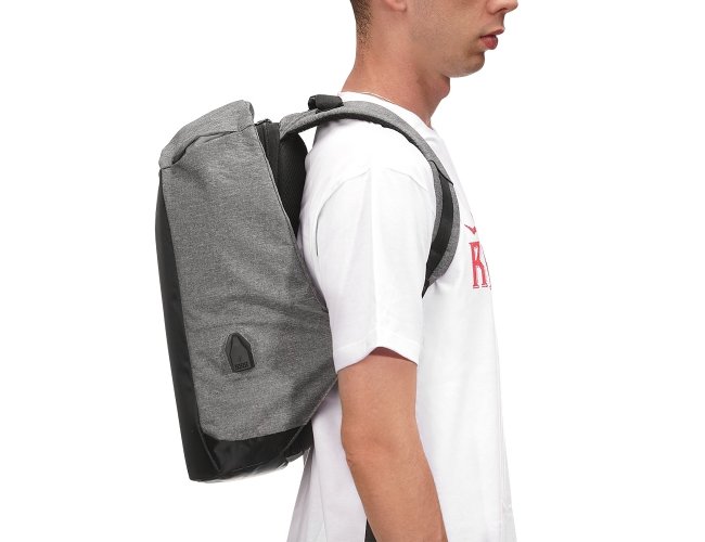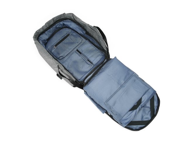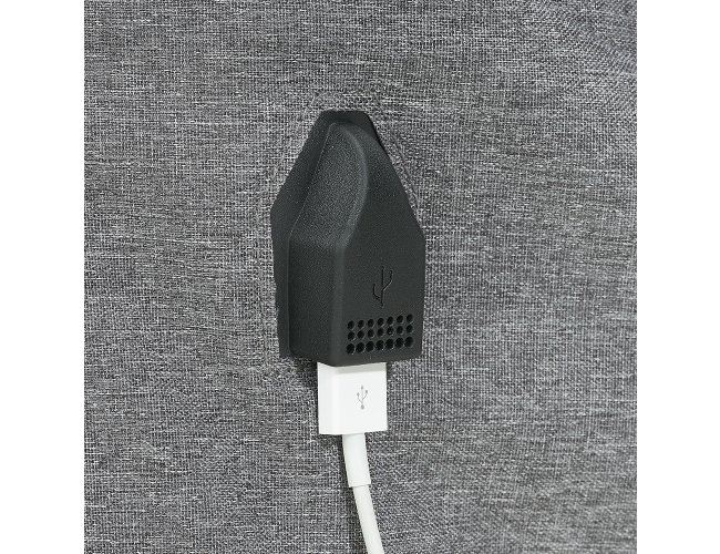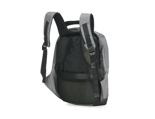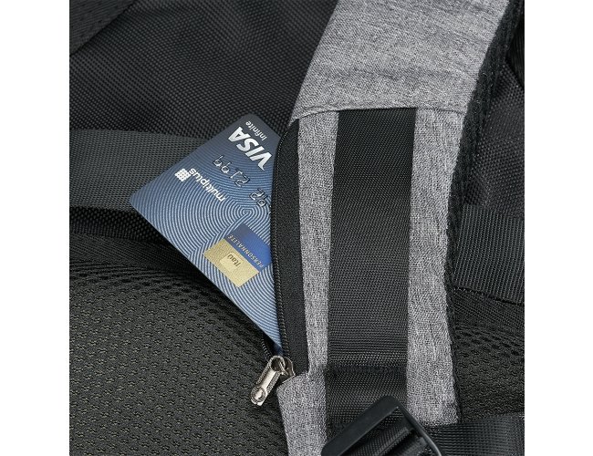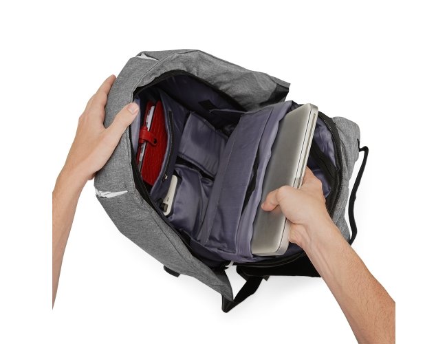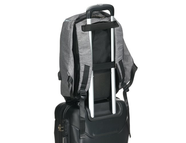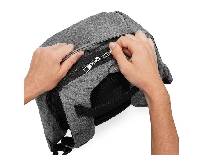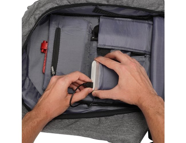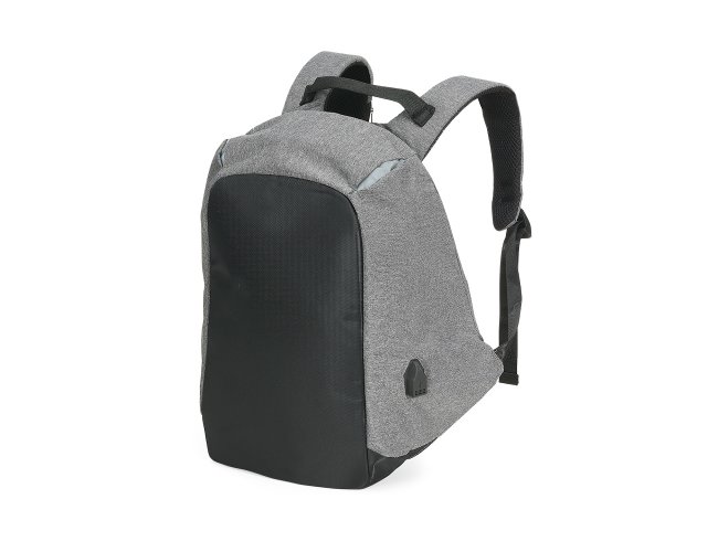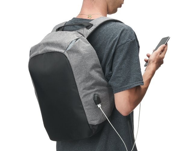 Mochila anti-furto de poliéster com detalhes em nylon. Com formato anatômico e design moderno, tem a parte frontal à prova d’água e tecido impermeável. Pensando na segurança do usuário foi confeccionado o compartimento principal na área traseira, impossibilitando a abertura do produto mesmo com a mochila na costa do usuário. Possui dispositivo com entrada USB na parte externa com cabo USB acoplado internamente; permitindo a conexão de um carregador portátil na área interna e a conexão de um eletrônico na área externa, viabilizando a carga e utilização do eletrônico enquanto caminha. Área interna do compartimento principal: bolso para notebook, quatro bolsos para acessórios, bolso com zíper; possui nas laterais internas sistema de velcro, maximizando a segurança da mochila. Alças para costa ajustáveis sendo uma delas com bolso de zíper, alça para mãos, alça horizontal para encaixe em malas de viagem, alças de costa e parte traseira revestidas com espuma para um maior conforto. Acompanha plaquinha para personalização.