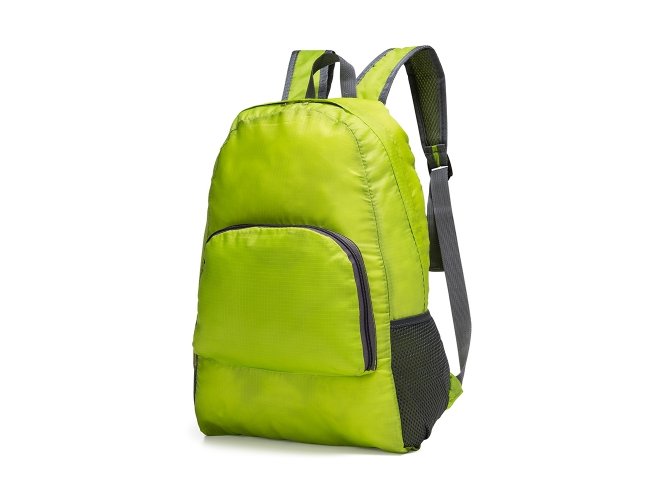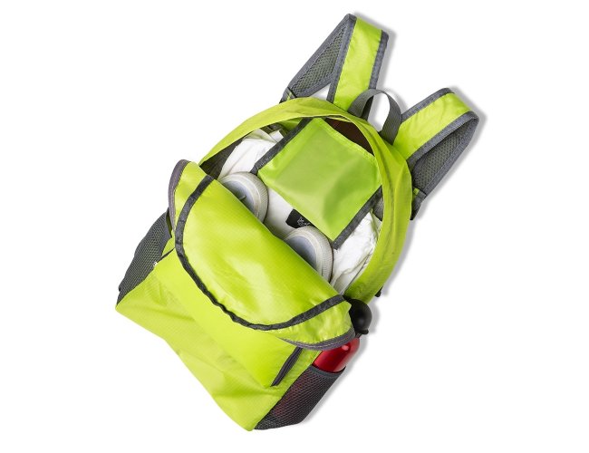 Mochila dobrável de 25 litros confeccionada em nylon impermeável. Compacta e com abertura prática, possui compartimento principal com pequeno bolso interno, bolsos laterais em malha e bolso frontal – compartimento responsável por acomodar a mochila.