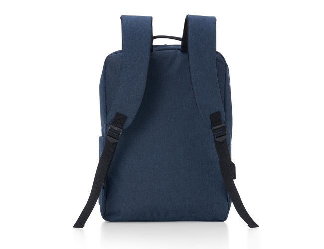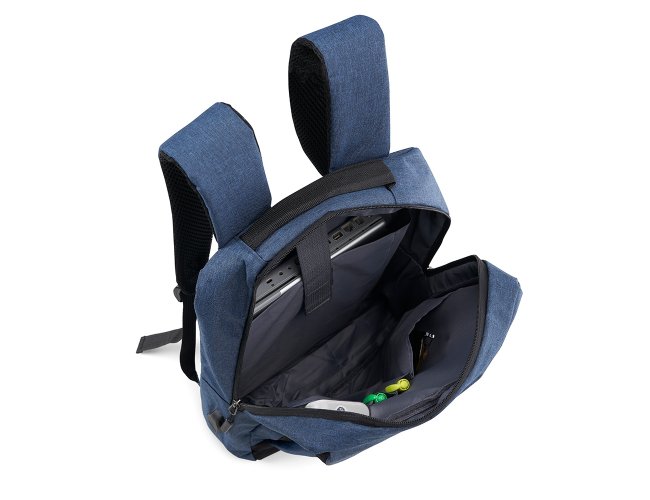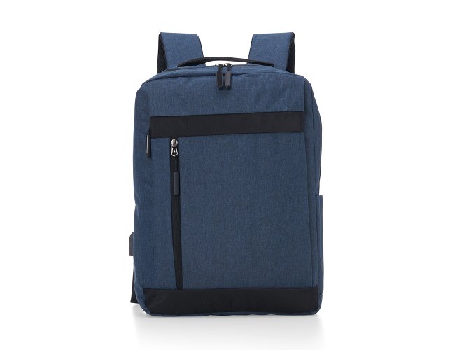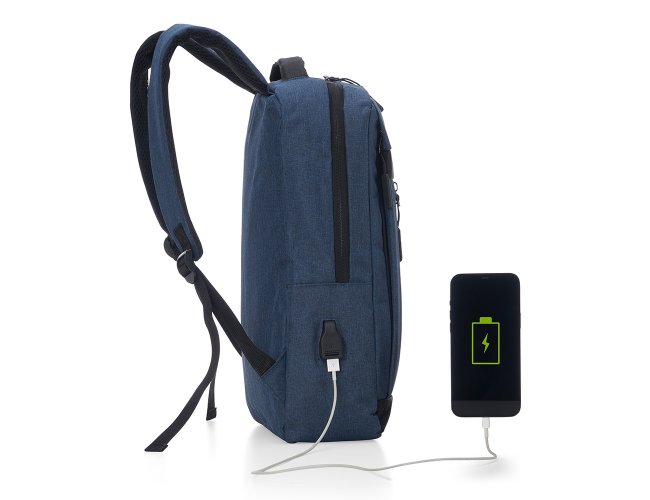 Mochila confeccionada em nylon com compartimento para notebook até 15,6 polegadas. Contém compartimento grande com divisórias para documentos, eletrônicos e caneta, dois compartimentos frontais com abertura vertical, bolso lateral e adaptador USB externo com cabo acoplado, permitindo a conexão de um carregador portátil de dentro da mochila e transferência da carga para o lado externo, ocultando o carregador e viabilizando a utilização do celular durante o processo. Contém zíperes com pegadores plásticos, alça de mão em nylon e alças para as costas ajustáveis com revestimento espumado antitranspirante.