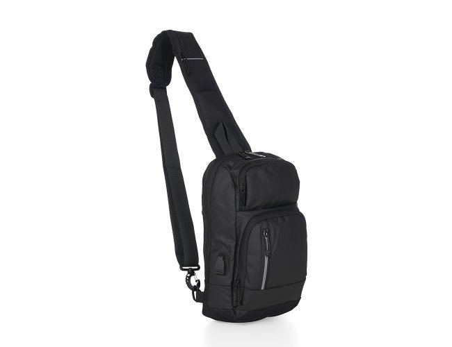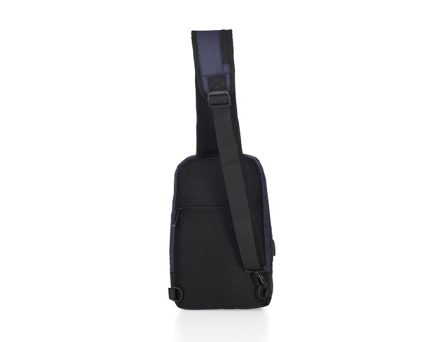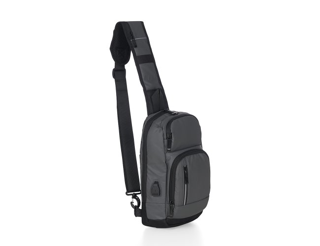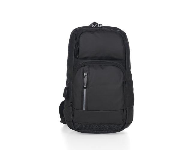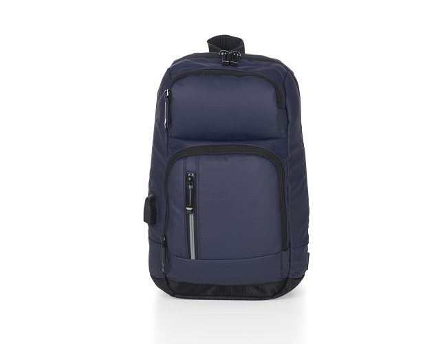 Mochila de ombro com entrada USB lateral. A mochila possui 3 bolsos frontais 1 compartimento principal e 1 bolso traseiro, sendo 1 bolso frontal com detalhe refletivo no zíper, além de 3 compartimentos internos, sendo 1 para armazenar tablet, netbook ou Ipad de até 9 polegadas. Alça com tira de nylon, 2 fivelas para opção de encaixe, parte traseira com revestimento espumado antitranspirante, e alça de mão em nylon.