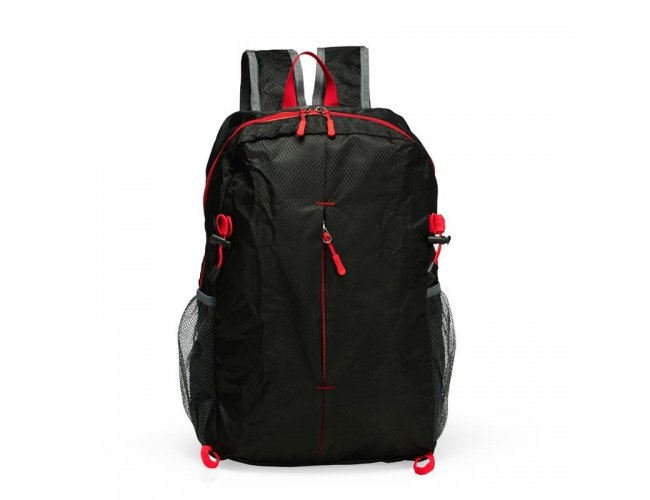 Mochila dobrável confeccionada em poliéster impermeável e detalhes em plástico, com fechamento em zíper e capacidade máxima de 16 litros. Possui compartimento interno com divisória para notebooks de até 15,6 polegadas. Conta com bolso frontal com zíper, dois bolsos laterais em tela com elástico, alça superior em nylon e duas alças traseiras com tecido telado interno. Acompanha saco em nylon com regulagem, que facilita o transporte quando dobrada.
