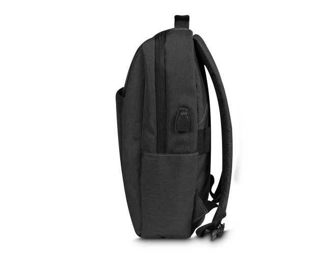 Mochila produzida em tecido de poliéster e PU, alça de ombro acolchoada, bolsos frontais com zíper,dois compartimentos laterais, aceita notebooks de até 15,6”. Alça de ombro ajustável, porta USB na lateral da mochila, compartimento com zíper na alça de ombro para pequenos objetos.