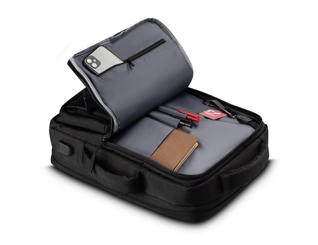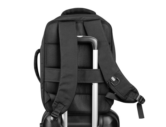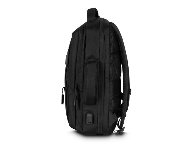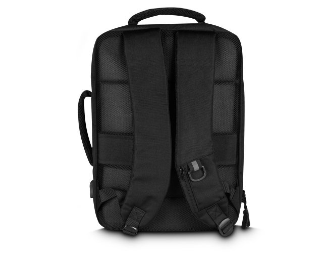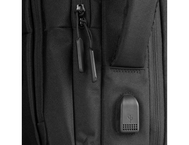 Mochila produzida em tecido de poliéster, alça de ombro e mão acolchoada,2 bolsos frontais e divisórias internas, aceita notebooks de até 15,6", porta USB na lateral da mochila, possui engate para mala de viagem.