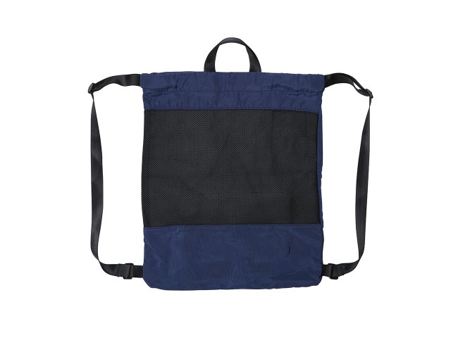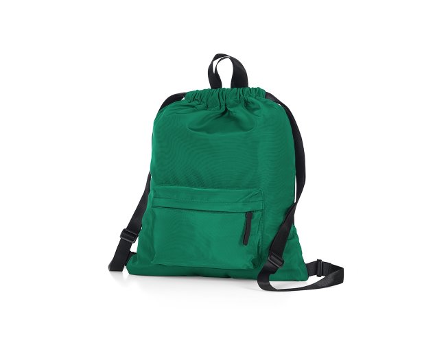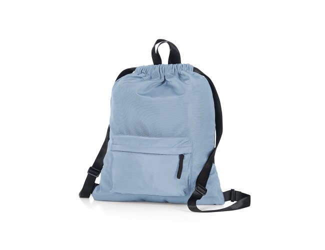 Mochila saco em poliéster com detalhes em nylon. Contém bolso de zíper na parte frontal, alça de mão e alças de nylon para as costas. Tecido resistente a água e parte traseira em material antitranspirante.