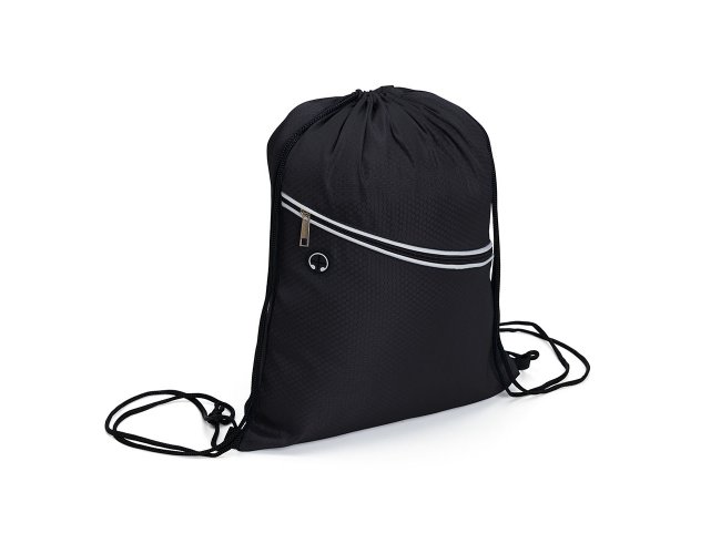 Mochila saco impermeável em fibra de poliéster. Contém bolso diagonal na parte frontal com entrada para fones de ouvido e alças de nylon.