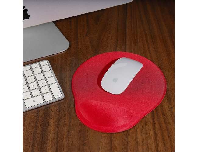 Mouse Pad ergonômico de neoprene com apoio para o punho de silicone. Parte inferior revestida com silicone antiderrapante.