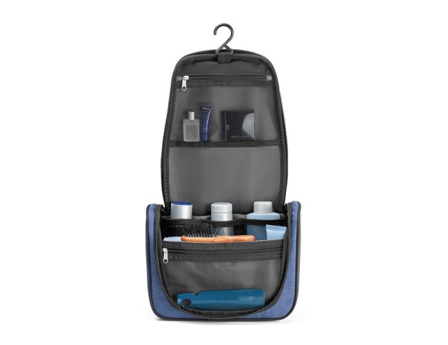 Nécessaire. 600D de alta densidade. Com vários bolsos interiores e gancho de pendurar. Dimensões: 250 x 180 x 105 mm.