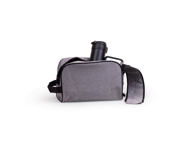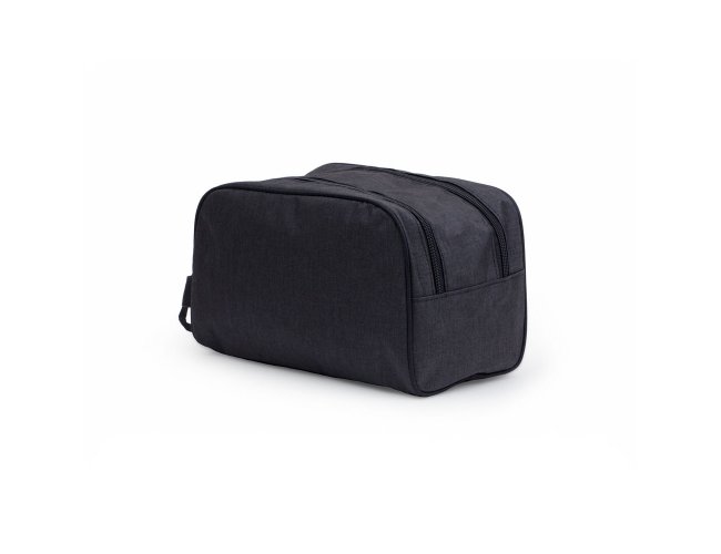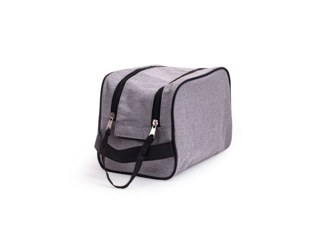 Necessarie tecido polyester, cursor duplo para fechamento com alça, trava com velcro, alça de mão, gravação Frontal.