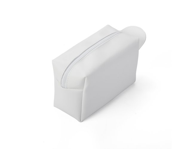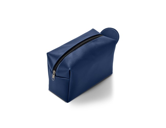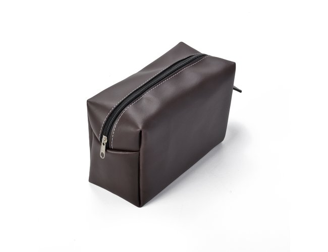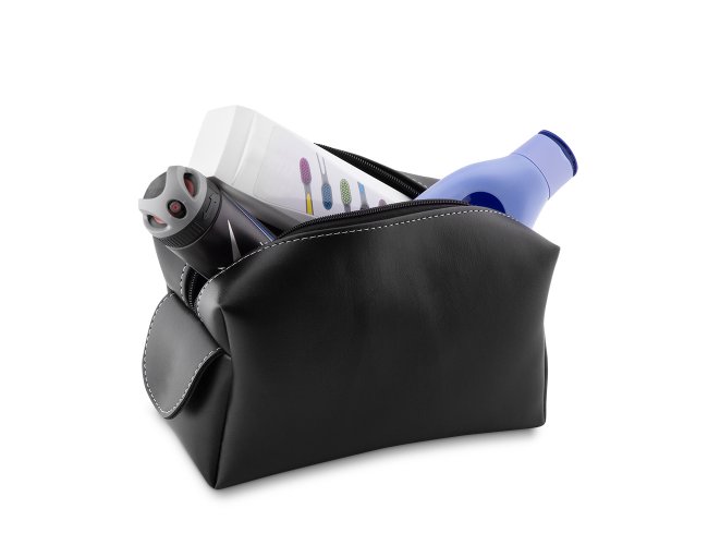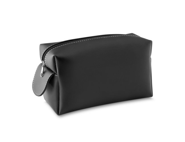 Necessaire em couro sintético preto com pegador lateral. Gravação frontal na opções: serigrafia e plaquinha.