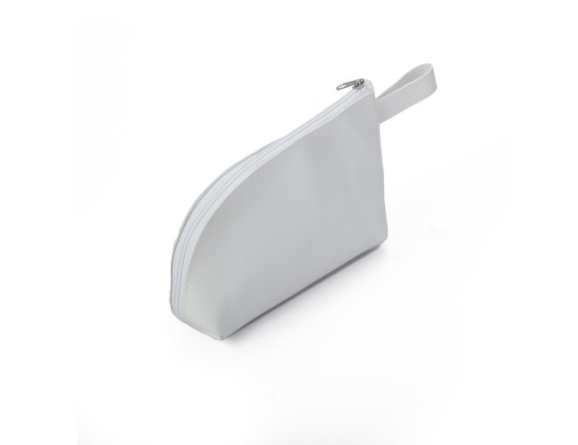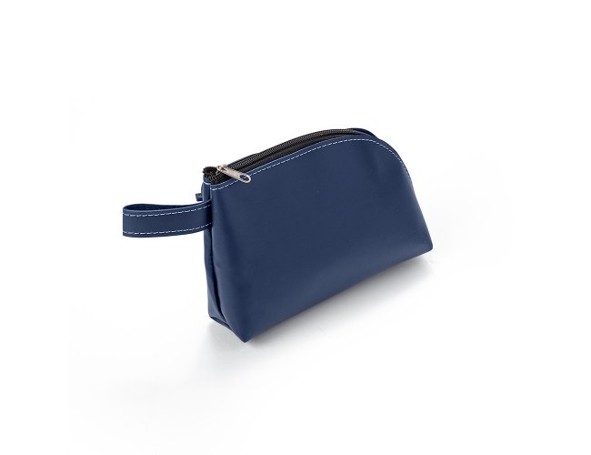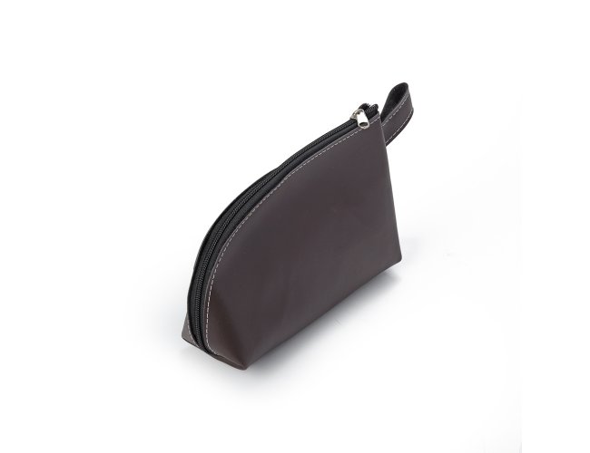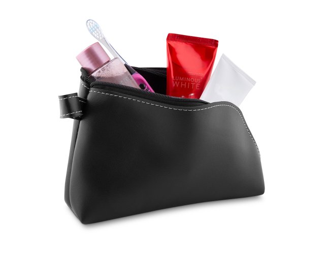 Necessaire em couro sintético preto com alça lateral. Gravação frontal na opções: serigrafia e plaquinha.
