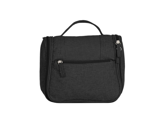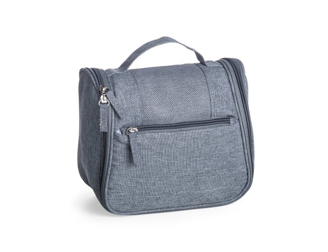 Necessaire organizadora em tecido nylon Oxford, possui bolso frontal e alça superior, parte interna com gancho plástico; bolso interno superior em nylon e bolso de tela ambos com zíper; bolso inferior aberto de tela com 4 divisões de bolsos também em tela.