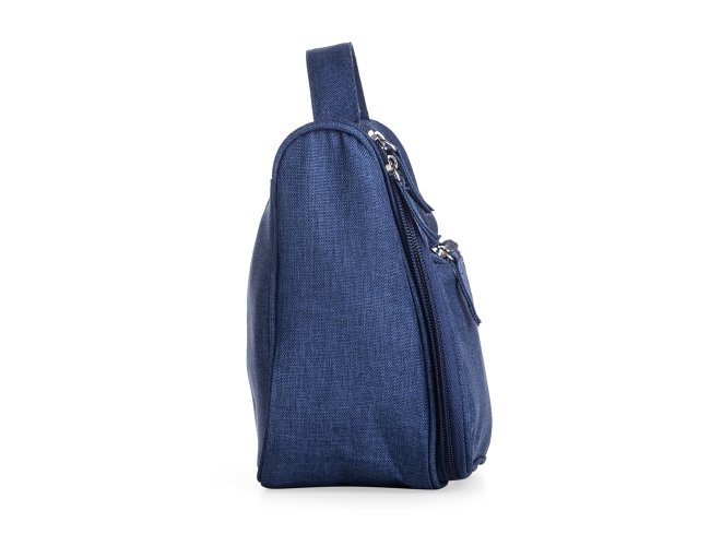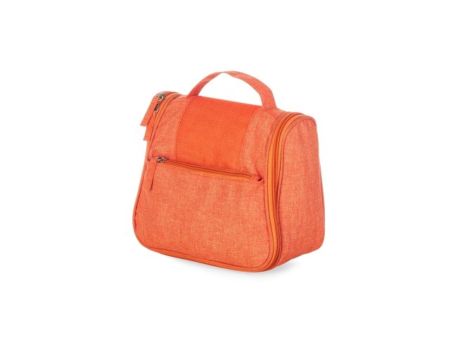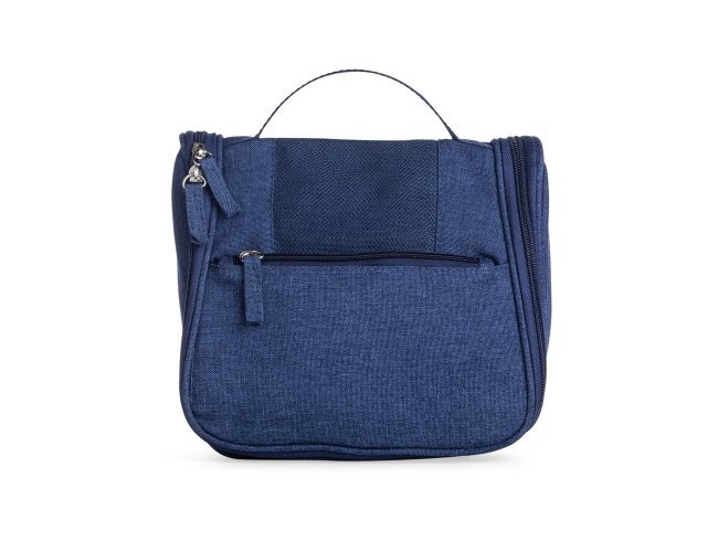 Necessaire organizadora em tecido nylon Oxford, possui bolso frontal e alça superior, parte interna com gancho plástico; bolso interno superior em nylon e bolso de tela ambos com zíper; bolso inferior aberto de tela com 4 divisões de bolsos também em tela.