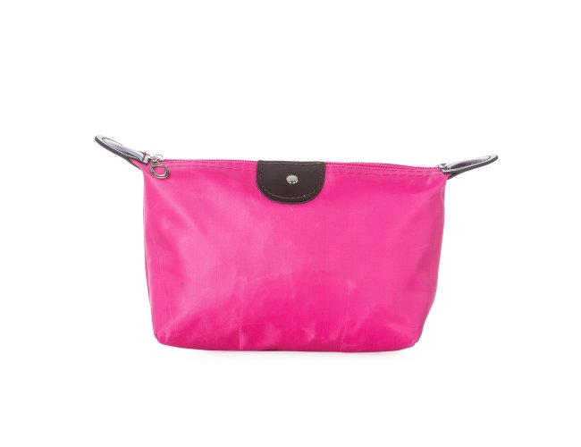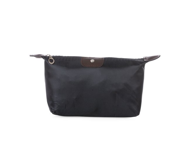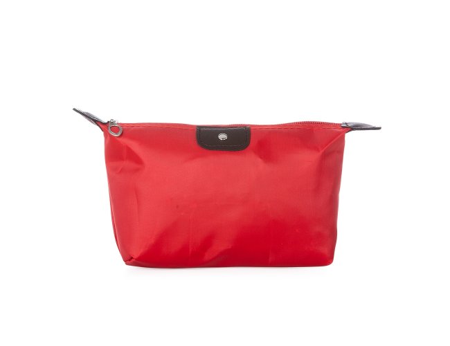 Necessaire impermeável de poliéster com detalhes em couro sintético e parte interna com revestimento emborrachado, possui um “botão” no detalhe do couro frontal.