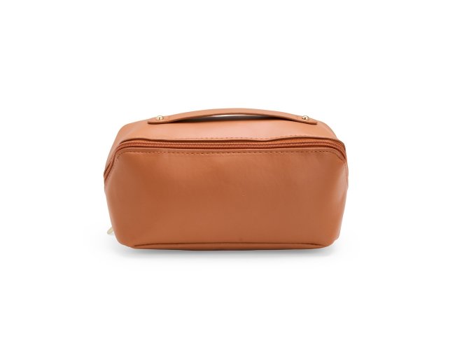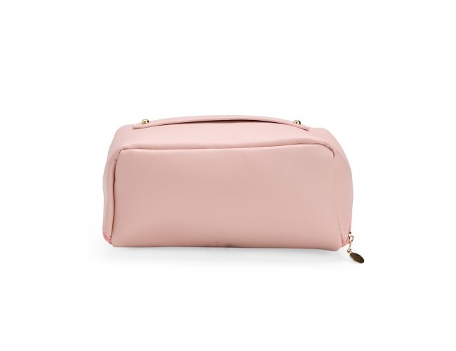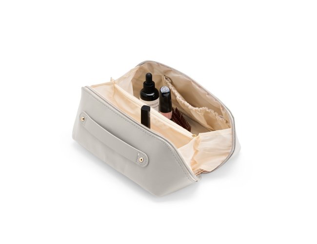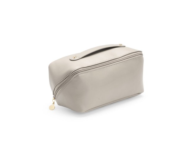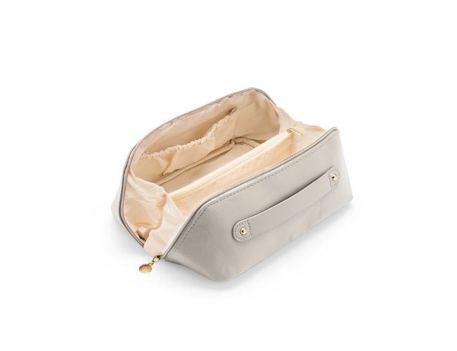 Um nécessaire versátil feito em poliuretano (PU) impermeável com abertura em 180 graus que remete ao formato de uma concha. O compartimento interno conta com dois bolsos laterais abertos e um, localizado na parte central do nécessaire, com fechamento em zíper. Possui alça para transporte.