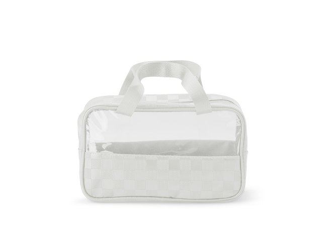 Nécessaire de PVC e couro sintético impermeável em xadrez . Possui visor transparente e duas alças laterais de mão em nylon.