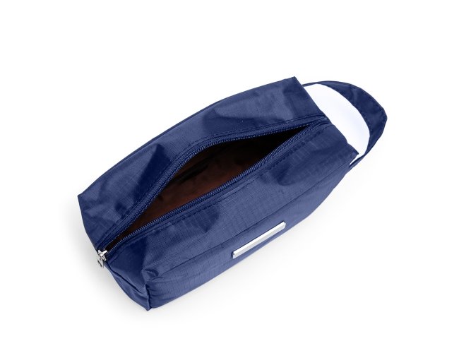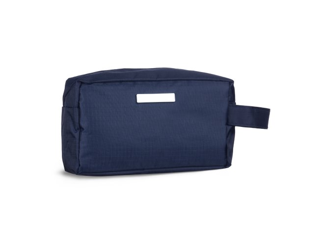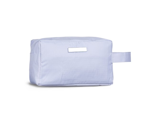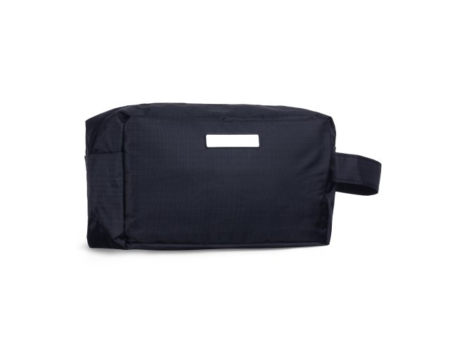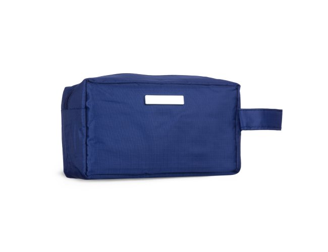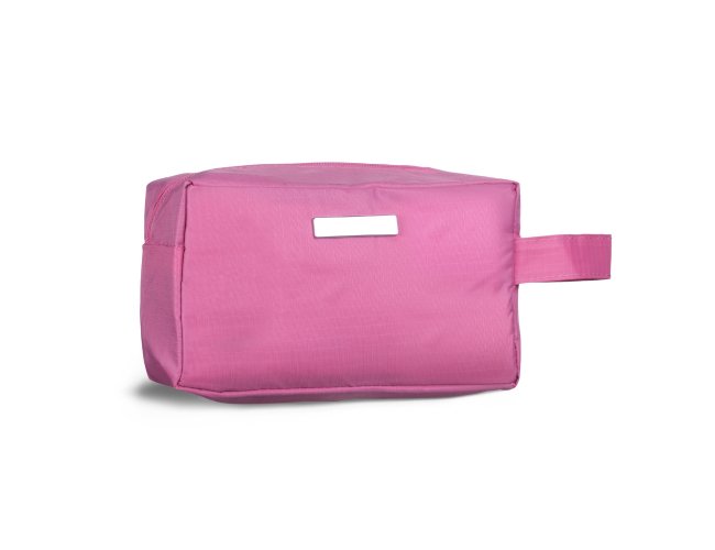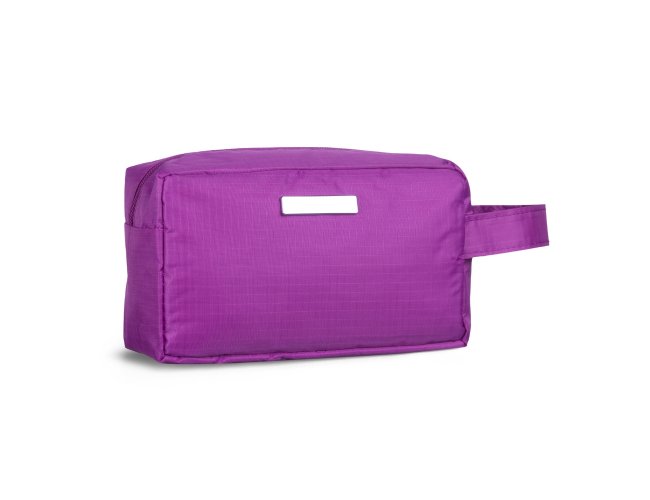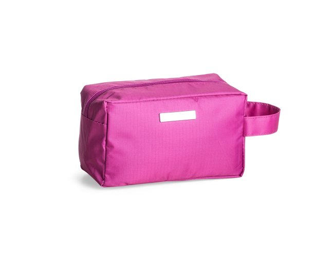 Necessaire impermeável de pvc com plaquinha metálica para personalização, possui alça lateral, zíper e forro de poliéster.