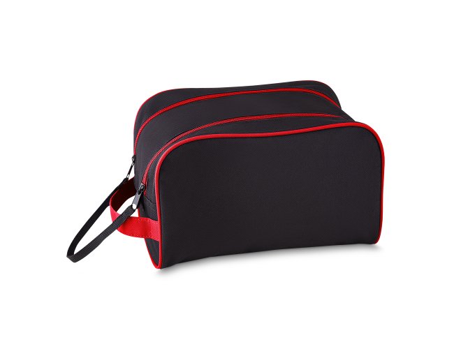 Necessarie tecido poliéster 300, cursor duplo para fechamento com alça, trava com velcro, alça de mão, gravação Frontal.