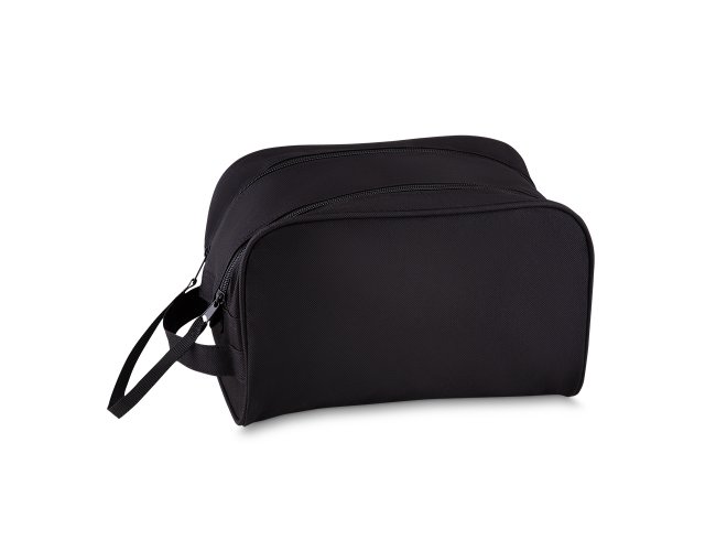 Necessarie tecido poliéster 300, cursor duplo para fechamento com alça, trava com velcro, alça de mão, gravação Frontal.