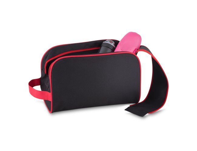 Necessarie tecido poliéster 300, cursor duplo para fechamento com alça, trava com velcro, alça de mão, gravação Frontal.