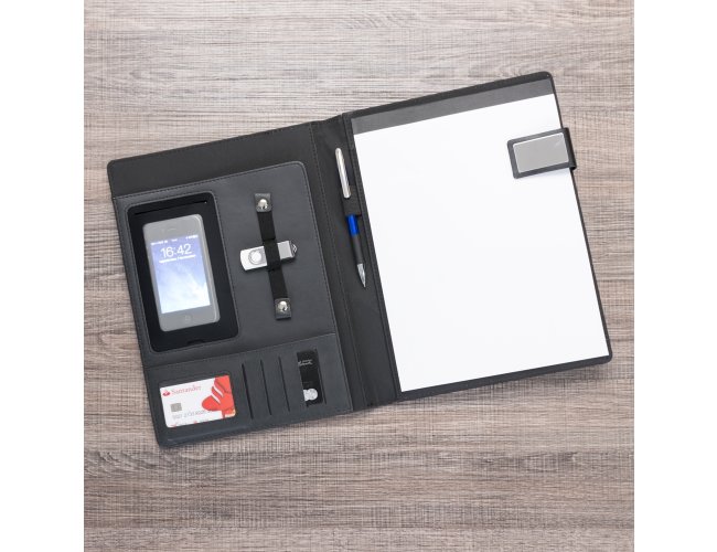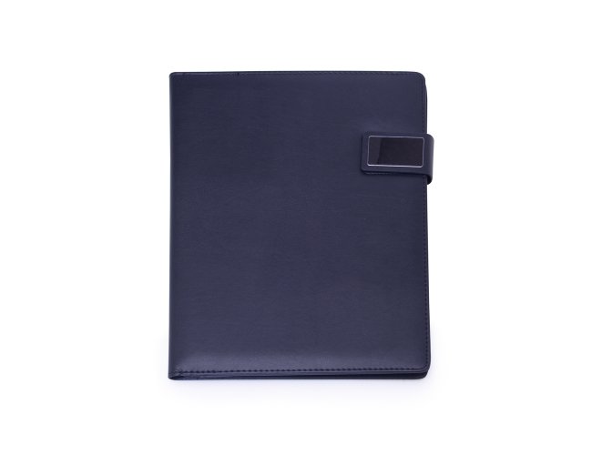 Pasta convenção de couro sintético com trava de imã lateral, possui uma placa de metal na trava ideal para personalização. Possui “bolso” para arquivar documentos, porta celular com visor fosco, porta cartões com divisórias e visor além de um bolso atrás, suporte elástico para caneta(não acompanha) e bloco A4 com aproximadamente 20 folhas brancas pautadas de verso liso.