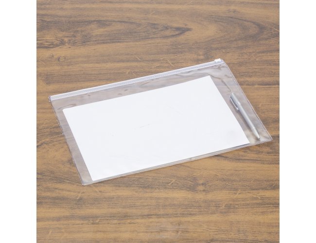 Pasta de pvc cristal transparente com fechamento zip zap. OBS.: Para prolongar a vida útil do material pvc, atente-se as condições ideais de armazenamento: mantenha o material em local seco e arejado, livre da exposição ao sol e altas temperaturas.