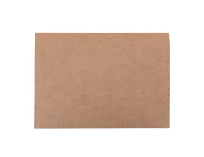 Pasta envelope ecológica, possui abertura superior fixada por um botão imãtizado. Detalhes costurados nas laterais, material em kraft.