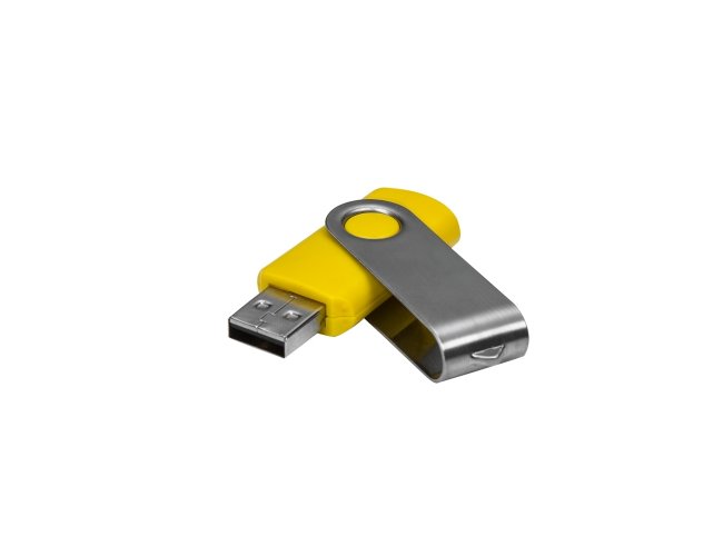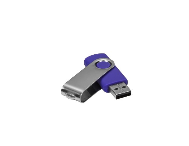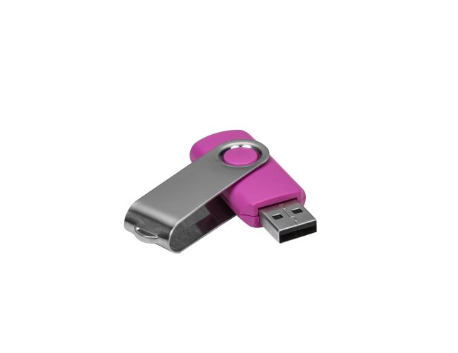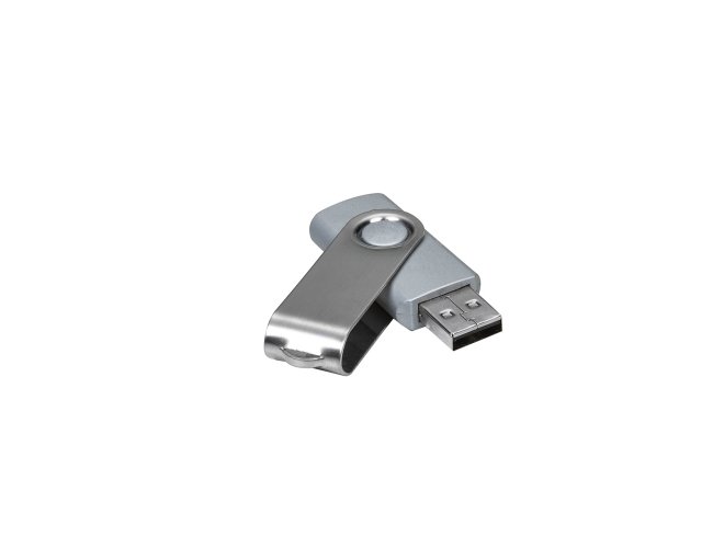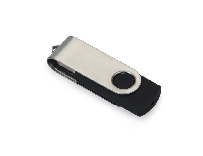 Pen drive de metal giratório 16GB, parte interna preta em plástico resistente. Possui uma “argola” na parte em metal que poderá ser utilizado para colocar algum cordão.