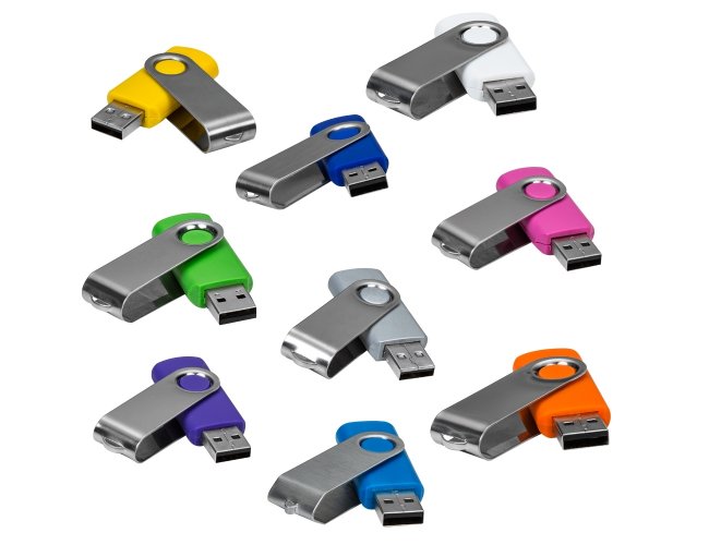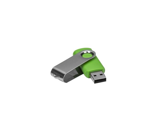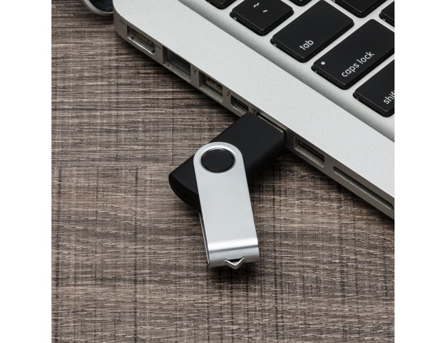 Pen drive de metal giratório 4GB, parte interna preta em plástico resistente. Possui uma “argola” na parte em metal que poderá ser utilizado para colocar algum cordão.